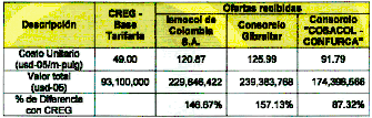 3.11. Al momento de comparar los valores utilizados por la Comisión de Regulación de Energía y Gas para la definición de la tarifa, con aquellos que efectivamente se lograron con la apertura de la convocatoria, difieren de forma importante, tal y como se establece en los siguientes cuadros: