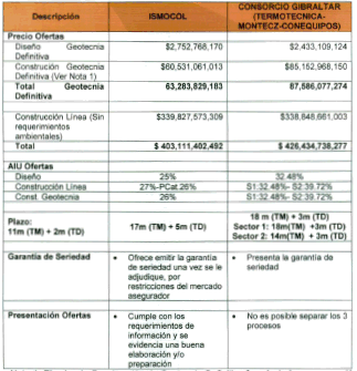 Derivado de esa segunda convocatoria, TRANSORIENTE recibió dos propuestas en valores que rondaban aproximadamente los USD 160 millones, es decir, alrededor de tres veces el presupuesto aprobado por la Comisión de Regulación de Energía y Gas.