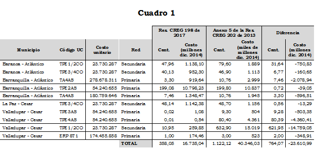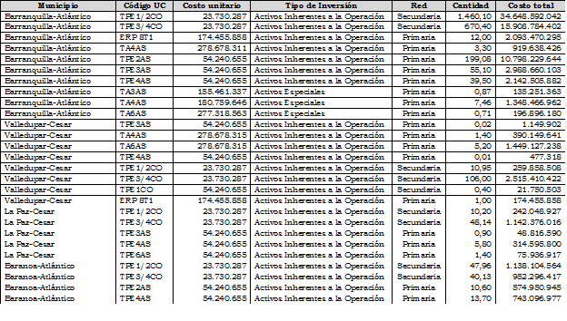 Teniendo en cuenta que para el cálculo del cargo aprobado mediante la Resolución CREG 198 de 2017 no se consideraron $20.935,54 millones correspondientes a Inversiones Existentes y eso conlleva a que no se remuneren en su totalidad las inversiones del mercado, se considera necesario calcular nuevamente el cargo transitorio de distribución para usuarios de uso residencial y el cargo transitorio de distribución para usuarios diferentes a los de uso residencial para el mercado conformado por los municipios de Barranquilla, Soledad, Malambo, Baranoa, Galapa, Puerto Colombia, Sabanagrande, Luruaco, Palmar de Varela, Polonuevo, Ponedera, Sabanalarga, Santo Tomás, Candelaria, Juan de Acosta, Campo de la Cruz, Santa Lucía, Usiacurí, Manatí, Suan, Repelón, Tubará y Piojó en el departamento de Atlántico; Santa Marta, Ciénaga, Fundación, Aracataca, Zona Bananera, Puebloviejo, Sitionuevo, El Retén, Remolino, Salamina, El Piñón, Cerro de San Antonio, Tenerife, Zapayán, Concordia y Pedraza en el departamento de Magdalena; Valledupar, La Paz y Manaure en el departamento de Cesar; Calamar, San Estanislao, Soplaviento, Arroyohondo y San Cristóbal en el departamento de Bolívar.