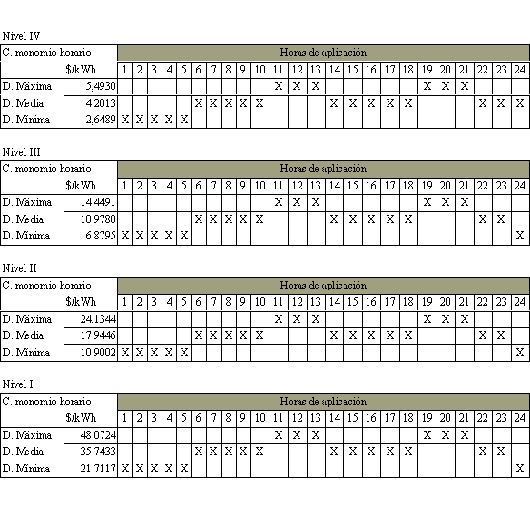 Artículo 2°. Cargos monomios horarios. Los cargos monomios horarios por uso del Sistema de Transmisión Regional y/o Distribución Local operado por las Empresas Municipales de Cartago, serán los siguientes, a pesos de diciembre de 1996: