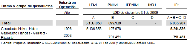 Artículo 2. Inversión Existente para el Gasoducto Neiva – Hobo. Como inversión existente, IEt, se reconocen US$ 5.244.536 (dólares de diciembre de 2009) de acuerdo con la desagregación presentada en el Anexo 1 de esta Resolución.
