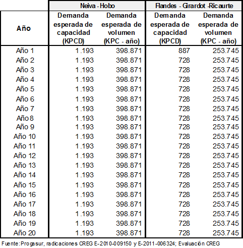 Demandas esperadas para los gasoductos Neiva – Hobo y Flandes – Girardot – Ricaurte