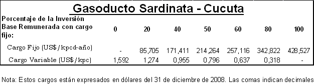 La Comisión de Regulación de Energía y Gas, en su sesión 416 del 1º. de septiembre de 2009 determinó aprobar los cargos regulados de transporte para el gasoducto Sardinata– Cúcuta, según solicitud presentada por PROGASUR.