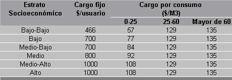 El cargo por unidad de consumo se liquidará conforme el siguiente procedimiento: el consumo total del usuario se descompondrá por bloques de consumo, según la clasificación determinada en el presente artículo. Cada uno de los metros cúbicos correspondientes al primer bloque de consumo se liquidará a la tarifa fijada para este bloque; cada uno de los metros cúbicos correspondientes al segundo bloque de consumo se liquidará a la tarifa establecida para tal bloque; y así sucesivamente se repetirá el procedimiento hasta cubrir la totalidad del consumo del usuario.