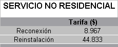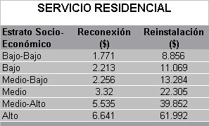 La reconexión o reinstalación del servicio de gas natural debido a la suspensión o corte ocasionado por alguna de las causales previstas en el decreto 1842 de 1991 y en la Ley 142 de 1994, se cobrará con las siguientes tarifas: