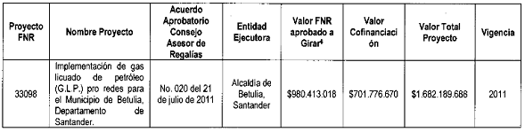Conforme al Acuerdo No. 020 de 2011 el Fondo Nacional de Regalías – en Liquidación aprobó recursos para el proyecto de masificación de gas licuado de petróleo GLP para el municipio de Betulia en el departamento de Santander.
