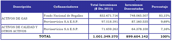 Respecto a la cofinanciación del proyecto, la empresa Proviservicios S.A. E.S.P. indica en su solicitud de aprobación de cargos, que los recursos aportados por el Fondo Nacional de Regalías financiaran la inversión correspondiente a los Activos inherentes a la operación de la Inversión Base para el proyecto de masificación de gas en el municipio de Betulia en el departamento de Santander corresponde a la suma de $832.671.716 ($ dic 2011).