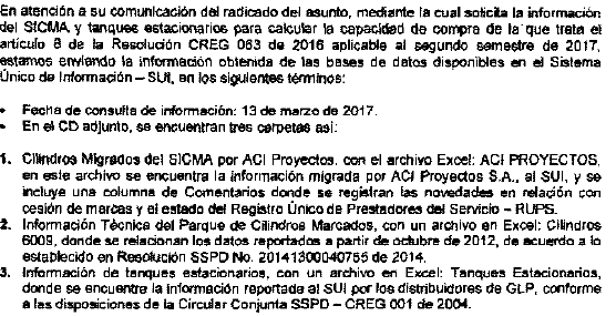 Atendiendo esta disposición, la Comisión de Regulación de Energía y Gas mediante comunicación con radicado CREG S-2017-000789 de 17 de febrero de 2017 solicitó a la Superintendencia de Servicios Públicos Domiciliarios la información del Sistema de Información de Cilindros Marcados (SICMA) a partir de la información entregada por la interventoría ACI, proyectos, hasta el año 2012, y la reportada por los distribuidores de GLP ante la Superintendencia, desde el año 2012 hasta la fecha, mediante la Resolución SSPD No. 20141300040755, en la cual se implementa lo dispuesto en el literal b del artículo 31 de la Resolución CREG 045 de 2008 (información del SICMA y del SICUN) 3 Lo anterior, teniendo en cuenta que mediante Resolución SSPD 20141200040755 de 2014 la Superintendencia de Servicios Públicos Domiciliarios implementó lo dispuesto en el literal b) del artículo 31 de la Resolución CREG 045 de 2008, donde dicha Entidad manifestó que había efectuado las adecuaciones correspondientes en el SUI, para darle continuidad al reporte de la información de Cilindros Marcados por parte de las empresas distribuidoras de la cadena de gas licuado de petróleo. Así mismo, esta Comisión mediante comunicación con radicado CREG S-2016-002119 de abril 18 de 2016 informó a la Superintendencia de Servicios Públicos Domiciliarios la importancia de hacer pública la consulta de esta información a efectos de la aplicación definitiva de la Resolución CREG 063 de 2016 “Por la cual se establecen parámetros de conducta y la participación de los agentes dentro de las actividades de comercialización mayorista y distribución de GLP”.. De igual forma, se solicitó remitir la información de tanques estacionarios atendidos por cada distribuidor y su capacidad en galones correspondiente al año 2016 de acuerdo con lo reportado a la Superintendencia de Servicios Públicos Domiciliarios en el Sistema Único de Información – SUI con base lo dispuesto en la Circular SSPD – CREG 001 de 2004. La Superintendencia de Servicios Públicos Domiciliarios atendió este requerimiento mediante las comunicaciones E-2017-002725 de 22 de marzo de 2017 y E-2017-003703 de 18 de abril de 2017.