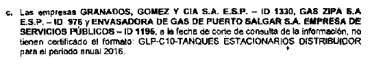 En este sentido, la capacidad definida en la Resolución CREG 042 de 2017 se realizó atendiendo el procedimiento establecido en el artículo 8 de la Resolución CREG 063 de 2016 con información del Sistema Único de Información – SUI con corte al 13 de marzo de 2017. Es por esto que la información de tanques estacionarios del SUI remitido por la Superintendencia para el caso de Gas Zipa se advierte que no reportaba información, por lo que en dicha comunicación y para el caso particular de esta empresa la Superintendencia precisó: