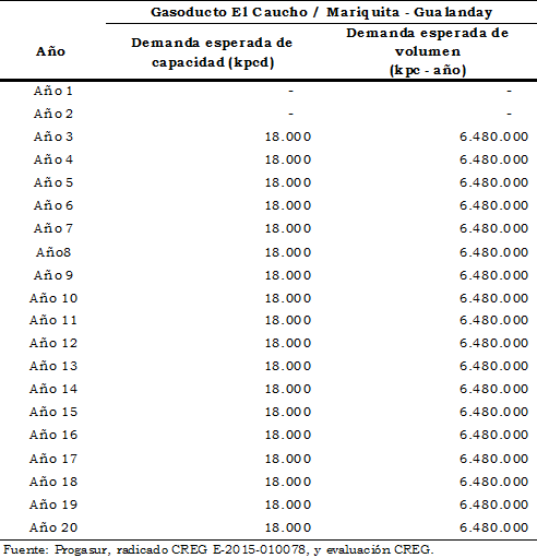 Artículo 5. Demandas Esperadas de Volumen y de Capacidad. La demanda esperada de volumen, DEVt, y la demanda esperada de capacidad, DECt, que sirvieron de base para el cálculo de los cargos que aquí se aprueban, de conformidad con los criterios generales establecidos por la Comisión de Regulación de Energía y Gas, son las presentadas en el Anexo 2 de esta Resolución.