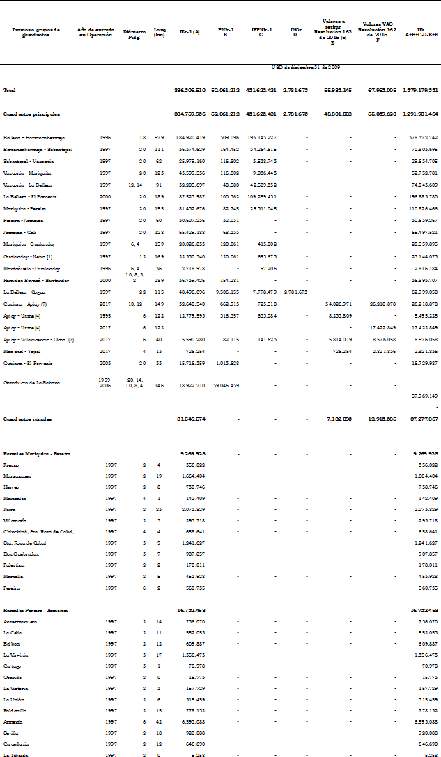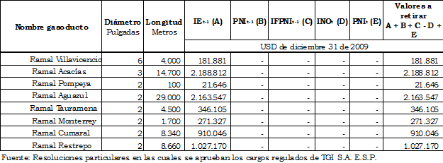 “Artículo 3. Inversión Existente. Como inversión existente, IEt, se reconocen US$ 1.291.901.464 (dólares de diciembre 31 de 2009) para los gasoductos principales y US$ 87.277.867 (dólares de diciembre 31 de 2009) para los gasoductos ramales de acuerdo con la desagregación presentada en el Anexo 4 de esta Resolución”.