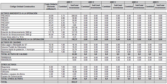 La Empresa, mediante la comunicación en mención, presentó las proyecciones de gastos de AOM de distribución y el programa de nuevas inversiones, clasificadas según el listado de unidades constructivas establecido en el Anexo No. 1 de la Resolución CREG 011 de 2003.