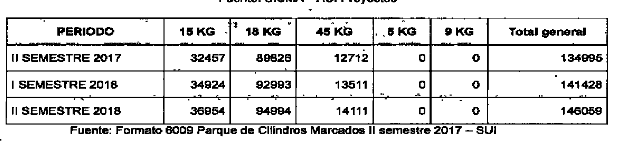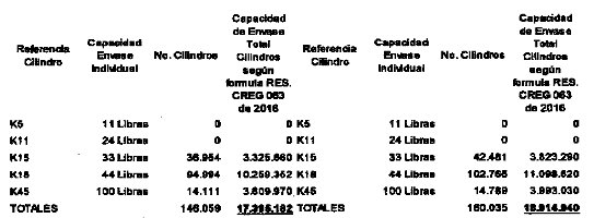 Los cilindros referencia K5 reportados por nuestra empresa al Sistema Único de información (SUI) son contenedores de Gas Licuado de Petróleo (Gas L.P.) fabricados por la Empresa Portuguesa AMTROL cuya capacidad de envasado es de cinco (5) kilos tal como se puede verificar en la ficha técnica que se aporta, lo que de acuerdo con las Resoluciones de la CREG equivalente a 11,01 libras. Adicionalmente, las cantidades que se han venido reportando en las anteriores Resoluciones CREG 075 del 2016 y CREG 042 de Abril 2017, para esta referencia fueron declarados 588.197 cilindros; sin embargo, en las Resoluciones CREG 168 de Nov de 2017 y CREG 048 de Abril de 2018, disminuyó la cantidad declarada en 4717 cilindros, sin que la compañía realzara reporte de destrucción de cilindros.