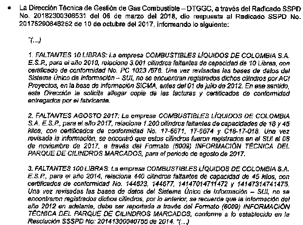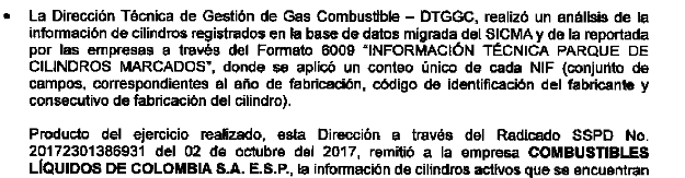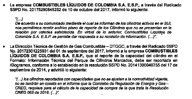 3. En relación con la determinación de la variable “Cap. Cil i,t" definida en la fórmula del parágrafo 3, articulo 8 de la Resolución CREG 063 de 2016, no se tuvo en cuenta la totalidad de cilindros adquiridos y reportados por COMBUSTIBLES LÍQUIDOS DE COLOMBIA S.A. E.S.P. en el SUI. durante el 2017 y hasta la fecha de consulta de la información.