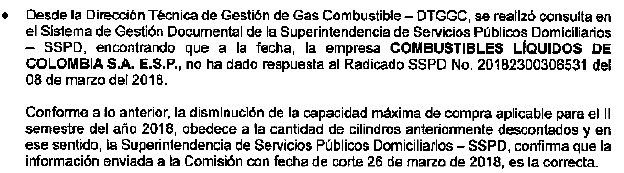 Mediante oficio con radicado CREG E-2018-005869 la Superintendencia de Servicios Públicos Domiciliarios a través de la Delegada de Energía Eléctrica y Gas Combustible remitió la información solicitada por esta Comisión. En atención a lo anterior procederá esta Comisión a exponer el análisis de los resultados de la misma a efectos de resolver las consideraciones y argumentos expuestos por parte de Combustibles Líquidos de Colombia en su recurso frente a la Resolución CREG 048 de 2018.
