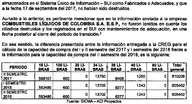 2. En relación con la determinación de la variable “Cap.2it" definida en la fórmula del parágrafo 2, articulo 8 de la Resolución CREG 063 de 2016, no se tuvo en cuenta la información de cilindros adquiridos y reportados por COMBUSTIBLES LÍQUIDOS DE COLOMBIA S.A. E.S.P. en el SUI durante el 2017 y hasta la fecha de consulta de la información