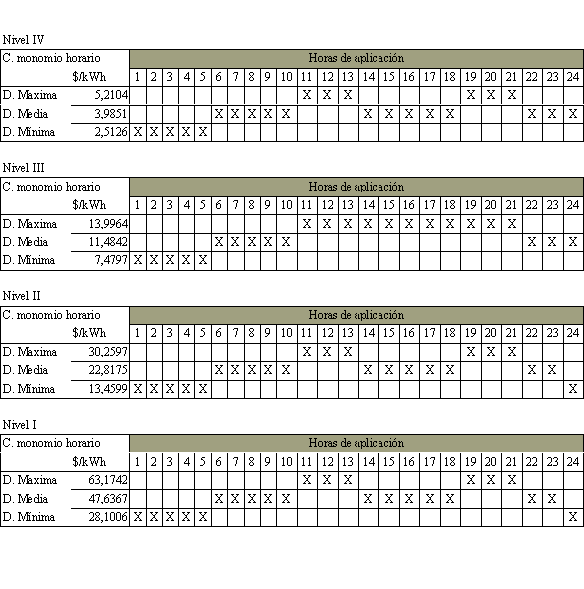 Artículo 2°. Cargos monomios horarios. Los cargos monomios horarios por uso del Sistema de Transmisión Regional y/o Distribución Local operado por la Empresa de Energía del Pacífico S.A., serán los siguientes, a pesos de diciembre de 1996: