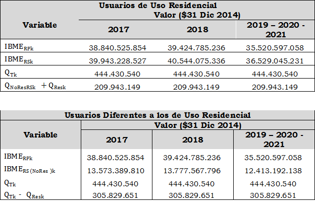 Aplicando la metodología contenida en la Resolución CREG 202 de 2013 y sus modificaciones y adiciones, se calcularon conforme a las formulas establecidas en los numerales 9.1.1.1. y 9.2.1.1. del artículo 9 para la componente que remunera los gastos de AOM, aplicable a usuarios de uso residencial y a usuarios diferentes a los de uso residencial, las siguientes variables principales: