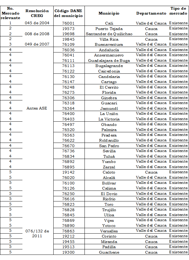 · Resolución CREG 076 y 132 de 2011: Municipios de Alcalá, Bolívar, Calima-Darién, El Dovio, Riofrio, Toro, Trujillo, Ulloa, Versalles, Vijes y Yotoco en el departamento del Valle del Cauca y Caloto, Miranda, Guachené, Corinto y Padilla en el departamento de Cauca.
