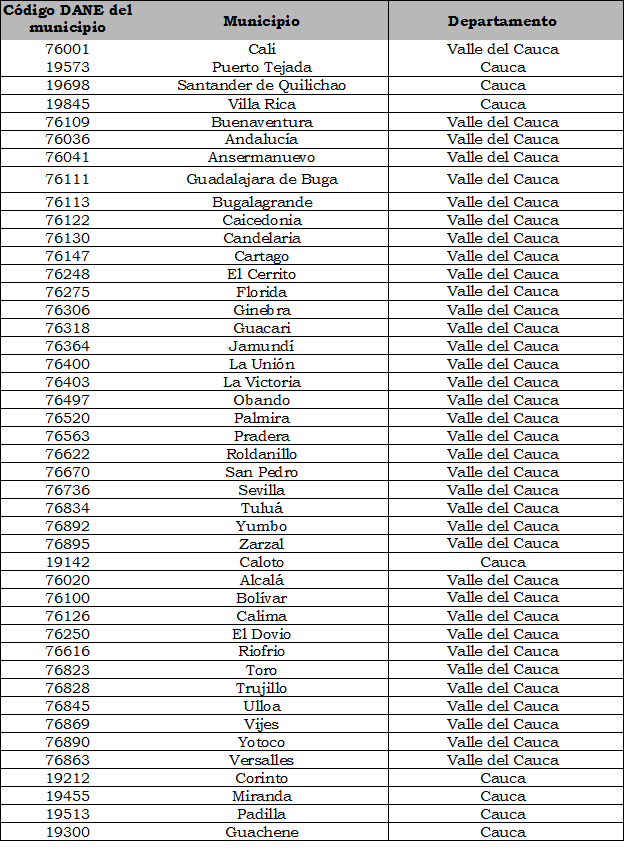 · Resolución CREG 049 de 2007: Municipio de Buenaventura, departamento de Valle del Cauca.