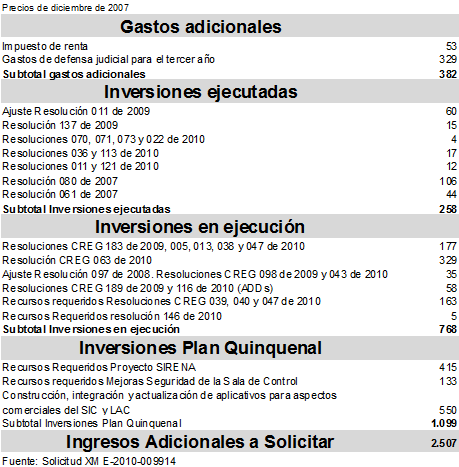 Mediante comunicación con radicado CREG – E 2010-009914, XM Compañía de Expertos en Mercados S.A. E.S.P. presentó a la CREG una solicitud de ajuste a la remuneración de los servicios regulados del CND, ASIC y LAC. El siguiente cuadro muestra la solicitud de ajuste: