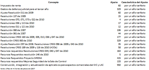 Mediante la Resolución CREG 074 de 2010, se hizo un ajuste a la remuneración para el tercer año del periodo tarifario, de los servicios regulados del CND, ASIC y LAC.