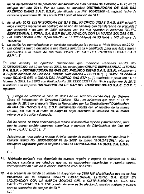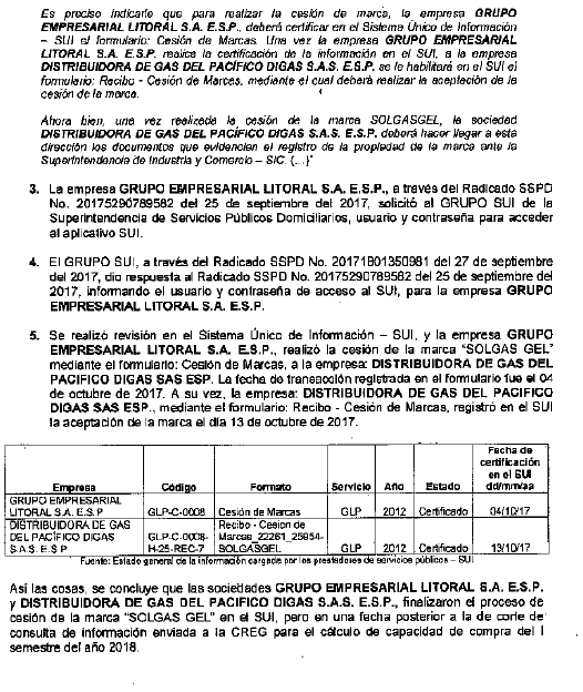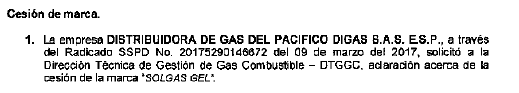 6 Igualmente, en el mes de octubre del 2017, DISTRIBUIDORA DE GAS DEL PACÍFICO DIGAS SAS ESP y GRUPO EMPRESARIAL LITORAL SA ESP SOLGASGEL legalizaron ante el SUI el trámite de cesión de marca de 3.885 cilindros.