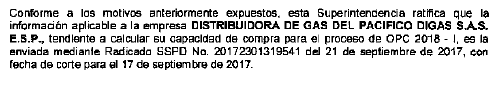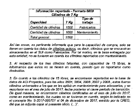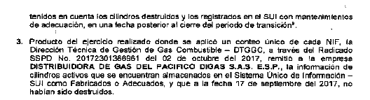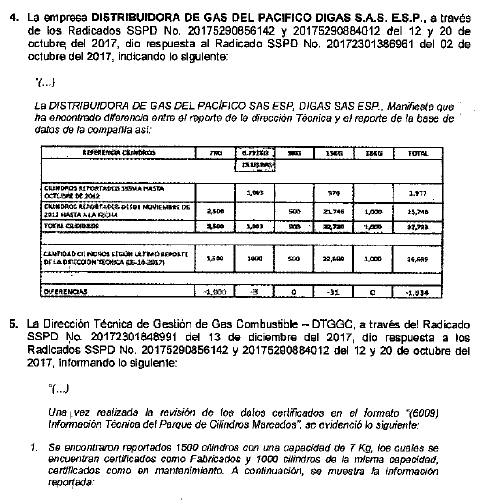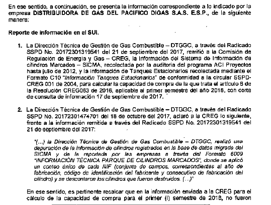 “(…) 5 De acuerdo con la información que reposa en el sistema de gestión documental de la empresa, DISTRIBUIDORA DE GAS DEL PACIFICO DIGAS SAS ESP ha realizado el reporte de 27 723 cilindros en total que se ven reflejados en el SUI con corte al 10 de septiembre de 2017, es decir que hacen falta en el reconocimiento de la capacidad de compra 1034 cilindros que efectivamente fueron reportados por la Empresa y fueron debidamente acreditados por la Empresa ante la SSPD.