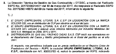En respuesta al auto de pruebas la Superintendencia de Servicios Públicos Domiciliarios expuso lo siguiente parta el caso de la empresa Distribuidora de Gas del Pacífico: