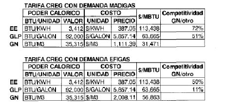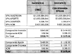 Como se puede observar en el paralelo de los escenarios, el cargo obtenido con una demanda razonable como es la calculada por Efigas, es superior en un 185% al cargo aprobado, lo cual afecta fuertemente las cifras de competitividad calculadas para la evaluación del proyecto.