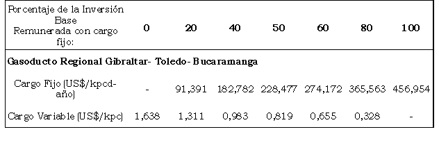 ARTÍCULO 7. CARGOS FIJOS Y VARIABLES REGULADOS DE REFERENCIA PARA LA REMUNERACIÓN DE LOS COSTOS DE INVERSIÓN. A partir de la vigencia de la presente Resolución, se aplicarán las siguientes Parejas de Cargos Regulados que remuneran los costos de inversión para el Gasoducto Regional Gibraltar-Toledo-Bucaramanga definido en el Artículo 3 de la presente Resolución: