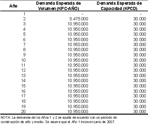 ARTÍCULO 5. DEMANDAS ESPERADAS DE VOLUMEN Y CAPACIDAD. Se consideran la Demanda Esperada de Volumen y la Demanda Esperada de Capacidad presentadas en el Anexo 2 de esta Resolución.
