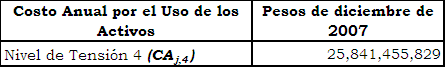 Sin embargo, por error involuntario, en el procedimiento de cálculo se utilizó el valor de 15.458.613.914 pesos de diciembre de 2007, el cual sólo refleja el costo de los activos que pertenecen al nivel de tensión 4.