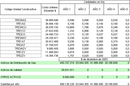 Que la solicitud tarifaria presentada por Nacional de Servicios Públicos Domiciliarios S.A. E.S.P. incluye las proyecciones de demanda, las proyecciones de gastos de AOM de distribución y el Programa de Nuevas Inversiones, clasificadas según el listado de unidades constructivas establecido en el Anexo No. 1 de la Resolución CREG 011 de 2003;