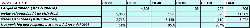 Para la expedición de la Resolución CREG 009 de 2006 se realizaron algunos ajustes a la metodología de asignación de metas lo que da como resultado un aumento en el tamaño del parque estimado y por tanto en el tamaño del parque de cilindros que se refleja en el mercado a partir de las ventas reportadas, lo que permitió la asignación de metas para algunas empresas de la ciudad de Cúcuta entre las cuales se encuentra Solgas. De igual forma, se asignaron de nuevo metas a la empresa en la Resolución CREG 048 de 2006.