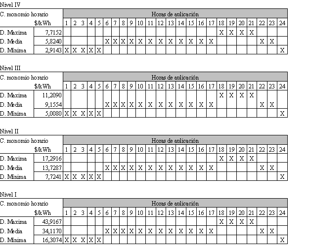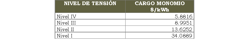 Artículo 2°. Cargos monomios horarios. Los cargos monomios horarios por uso del Sistema de transmisión Regional /o Distribución Local operado por la Empresa de Energía de Pereira S.A.-E.S.P., serán los siguientes, a pesos de diciembre de 1996: