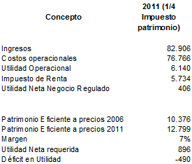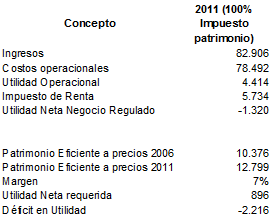 De esta forma, aún asumiendo una tasa de reconocimiento del 7% real para remunerar el margen al patrimonio, definido por parte de la CREG para un patrimonio de $10,376 millones a precios de 2006 ($12,799 millones a precios de 2011) se presenta un déficit para el año 2011 de 2,216 millones, tal como se ve en la siguiente tabla que muestra el presupuesto de 2011 para los servicios regulados CND, ASIC y LAC, incluyendo un impuesto al patrimonio de $1,726 millones y considerando el impacto tributario por la no deducibilidad en el impuesto de renta: