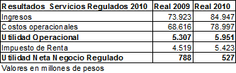 Al respecto, a continuación se relacionan los resultados de la operación de los servicios regulados para los años 2009 y 2010, que son los años realmente comparables debido a que estuvieron completamente bajo la metodología de ingresos definida en la Resolución 081 de 2010: