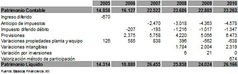 Ahora bien, el patrimonio contable de 2009 de $22,885 millones pasa a $23,263 millones en el 2010, es decir, un incremento de tan solo $378 millones. Mientras que si comparamos el patrimonio contable de 2009 ($22,885 millones) con el líquido (fiscal) de 2010 de $29,224 millones, existe una diferencia de $6,339 millones, la cual se origina por las partidas conciliatorias (provisiones de costos y gastos, provisión del incremento de los beneficios extralegales del pasivo pensional e impuesto diferido débito) en la depuración de la utilidad contable y fiscal. Vale anotar que este es el patrimonio líquido estimado que arroja el proyecto de declaración del impuesto sobre la renta del año gravable 2010.