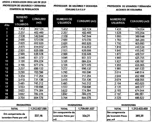 Revisados y comparados los Anexos 1 y 2 de la Resolución 163 de 2013 con las cifras presentadas por las empresas EDALGAS y ALCANOS DE COLOMBIA, podemos evidenciar que la Comisión de Regulación en esta Resolución tuvo en cuenta las inversiones presentadas por la empresa Alcanos de Colombia, dentro de las cuales no se incluyó el corregimiento de Anaime, y las proyecciones de usuarios y demanda presentado por la empresa EDALGAS que si tiene en cuenta el corregimiento de Anaime, (ver anexos 1 y 2.)