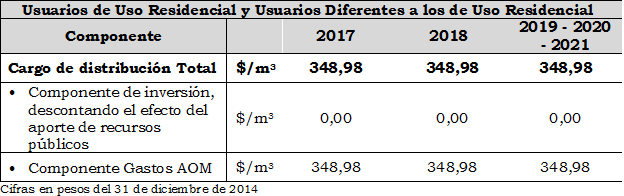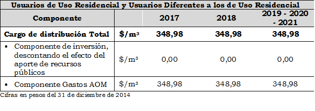 ARTÍCULO 5. Cargos de distribución aplicables a los usuarios de Uso Residencial y a los usuarios Diferentes a los de Uso Residencial. A partir de la vigencia de la presente Resolución, los cargos de distribución aplicables a los usuarios de uso residencial y a los usuarios Diferentes a los de Uso Residencial para recuperar los costos de inversión y los gastos de AOM para la distribución domiciliaria de gas combustible por red se fijan transitoriamente tal como se indica a continuación.