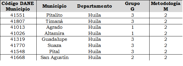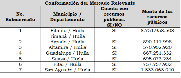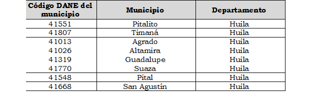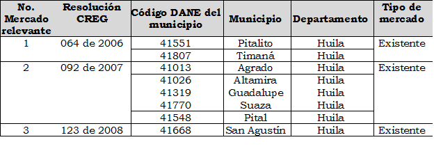 · Resolución CREG 092 de 2007: para el mercado relevante conformado por los municipios de Agrado, Altamira, Guadalupe, Suaza y Pital en el departamento de Huila.