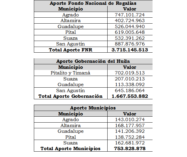 Mediante radicado CREG E-2018-005856 del 14 de junio de 2018, la Gobernación del Huila informa que “una vez revisada la información en conjunto con la Empresa Surcolombiana de Gas SA. ESP., sobre los aportes de la Gobernación del Huila en redes de distribución para los Municipios Pitalito, Timana (sic), Agrado, Altamira, Guadalupe, Suaza, Pital y San Agustin (sic), donde Surcolombiana de Gas SA. ESP., estipula un valor aportado en redes de distribución por parte de la Gobernación del Huila, en efecto, al validar la información se verificó que el aporte de la Gobernación del Huila corresponde a las inversiones realizadas en Convenios suscritos con la Empresa distribuidora”.