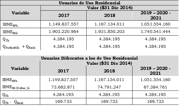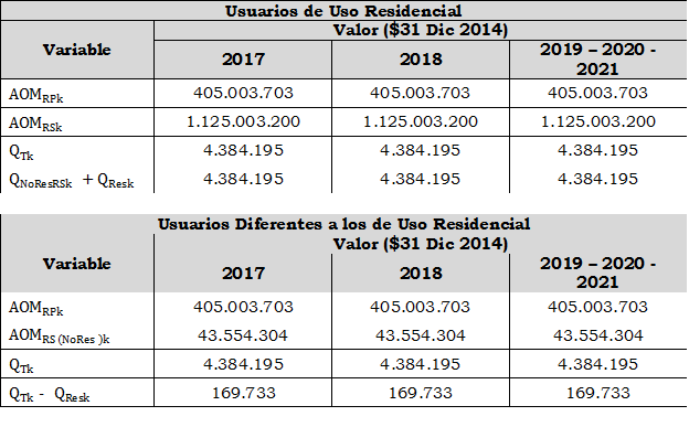 Aplicando la metodología contenida en la Resolución CREG 202 de 2013 y sus modificaciones y adiciones, se calcularon conforme a las formulas establecidas en los numerales 9.1.1.1. y 9.2.1.1. del artículo 9 para la componente que remunera los gastos de AOM, aplicable a usuarios de uso residencial y a usuarios diferentes a los de uso residencial, las siguientes variables principales: