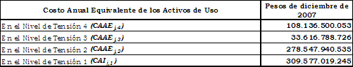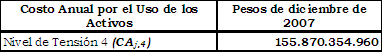 Artículo 1. Costo Anual por el uso de los activos del Nivel de Tensión 4. El Costo Anual por el Uso de los Activos del Nivel de Tensión 4 operados por CODENSA S.A E.S.P., calculado en la forma establecida en la Resolución CREG-097 de 2008, es el siguiente: