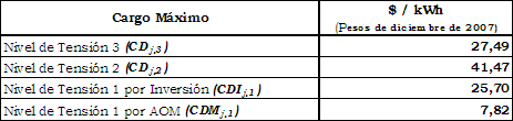 Artículo 2. Cargos Máximos de los niveles de tensión 3, 2 y 1. Los Cargos Máximos de los niveles de tensión 3, 2 y 1 del sistema operado por CODENSA S.A E.S.P., calculados en la forma establecida en la Resolución CREG-097 de 2008, son los siguientes: