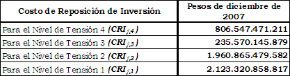 Artículo 5. Costos de reposición de la inversión. Los costos de reposición de la inversión del OR CODENSA S.A E.S.P. para cada nivel de tensión, calculados en la forma establecida en la Resolución CREG-097 de 2008, son los siguientes: