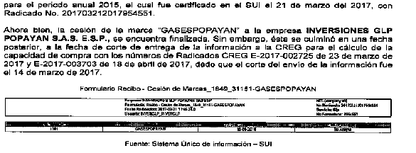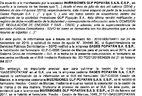 De acuerdo con lo expuesto por la Superintendencia se establece que los argumentos de la empresa en relación con la existencia de diferencias en la información del SUI en relación con la cesión de marca de la empresa Gases de Popayán a la empresa Inversiones GLP Popayán no son procedentes a efectos de modificar lo resuelto en la Resolución CREG 042 de 2017, toda vez que dicha empresa no llevó a cabo el cumplimiento de las obligaciones previstas en la Ley, la regulación 6Resolución CREG 023 de 2008, artículos 6 y 9. y la normativa en materia de reporte de información de la SSPD, en particular, de llevar cabo el diligenciamiento del formulario Cesión de Marca a pesar de que dicho formulario se encontraba habilitado previamente habilitado a la fecha de consulta de la información de la Superintendencia y que fue remitida a esta Comisión. Es decir, la información de la cesión de marca no fue tenida en cuenta en el envío remitido a la CREG por parte de la Superintendencia a efectos de la definición de la capacidad de compra, toda vez que la empresa Inversiones GLP Popayán no llevó a cabo el diligenciamiento del formato habilitado para ello.