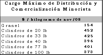 ARTÍCULO 3. Cargo Máximo de Distribución y Comercialización Minorista de GLP. Las empresas Distribuidoras de GLP al fijar su cargo a los usuarios finales regulados, quedan sometidas al régimen de libertad regulada previsto en la Ley 142 de 1994 y por lo tanto sólo podrán aplicar los siguientes cargos máximos para remunerar todas sus actividades, expresado en peso de noviembre de 2008.