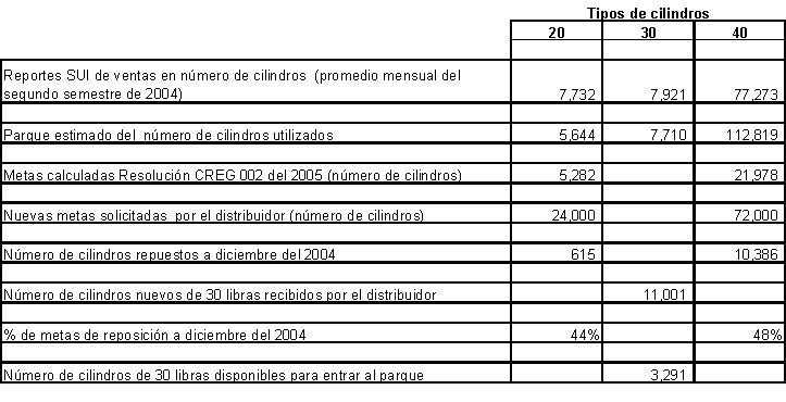 Adicionalmente la programación de cilindros de 40 libras ha contemplado un horizonte de varios años, lapso en el cual la totalidad de estos cilindros debe ser repuesto. De otra parte se considera que los cilindros de 20 libras que aun permanecen en el parque serán repuestos en el término de un año.